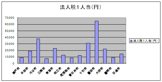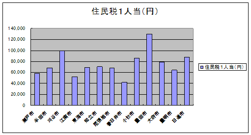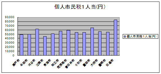 個人市民税1人当 個人市民税を人口で割ったもの。数値が高いほどその市に住んでいる個人の所得水準が高いことを示す。 |