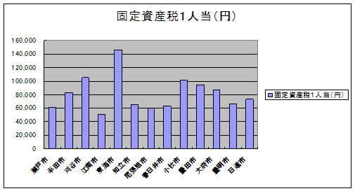 固定資産税1人当 固定資産税総額を人口で割ったもの。大都市と製造業種の多い市は、資産評価から数値が高くなる。 |