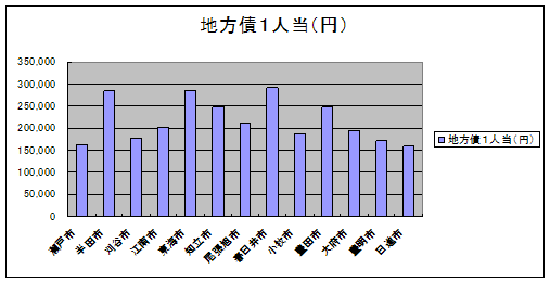 地方債1人当 地方債残高(市の借金)を人口で割ったもの。事業を行うのに必要なもので、低いから良いとするものでもない。 |