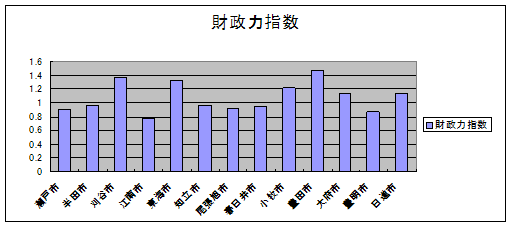 財政力指数 これは、地方公共団体の財政力を示す指標で、1を超えるほど財源に余裕があると言われ、地方交付税が交付されない。 |