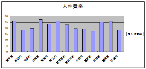 人件費率 歳出決算額に占める職員給、賃金の割合をしめす。 12年度のラスパイレス指数は102.4であり、県内の市平均100.3より高い。 |