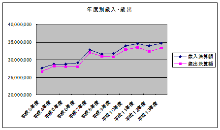 | 歳入決算額 | 27,609,998 | 28,823,819 | 28,773,892 | 29,099,253 | 32,890,274 | 31,567,228 | 31,685,411 | 34,005,974 | 34,542,232 | 33,992,591 | 34,632,171 |