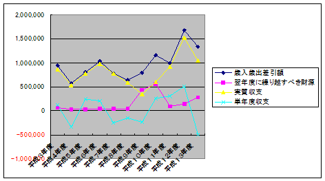 | 実質単年度収支 | -100,387 | -791,844 | 871,763 | 247,686 | -827,064 | -641,479 | -739,782 | 155,493 | 293,704 | 913,972 | -364,199 |