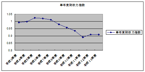 | 単年度財政力指数 | 0.992 | 0.998 | 1.024 | 1.021 | 1.011 | 0.98 | 0.958 | 0.936 | 0.89 | 0.91 | 0.91 |