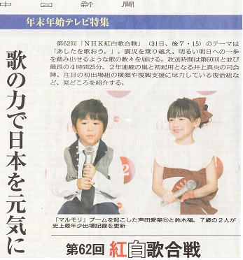 「マルモリ」ブームを起こした芦田愛菜、鈴木福。7歳の2人が史上最年少で第62回「紅白歌合戦」に出場。