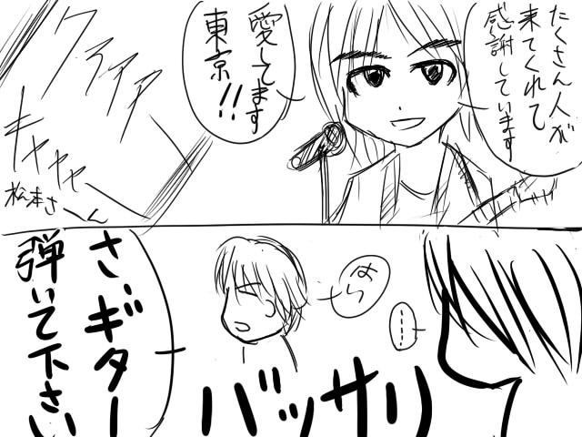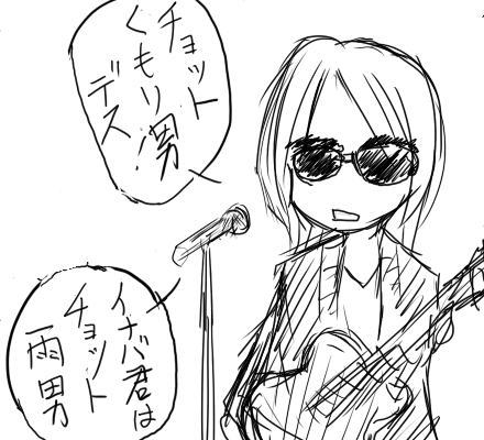 | 今回はわけあって東京で参加。 初の東京ドーム! 席はS席、1塁側の24通路7列目。 目の前はステージど真ん中が見えるなんとも見晴らしの良い席でした。 ステージ上の巨大スクリーンは真ん中にどデカイのがひとつ、左右に縦の楕円のがありました。 映画のような映像で始まり、「Introduction」が始まります。 そして「DIVE」へ! この曲はやはりライブ向け、盛り上がる! ![]() 金ピカのジャケットとズボンでした、稲葉さん。 は、派手だw ![]() 一方グラサン装備で服も黒という松本さん、ギターの赤が際立ってました。 イントロから「Time Flies」とアルバムの流れで。 そして恒例の「ようこそ」の挨拶シーン。 「B'zのライブジムにようこそー!!」は毎年どんなネタを仕込んでくるか楽しみであります。 今年は「B'zの・・・B'zの・・・」と稲葉さんが言う横から松本さんが「B'zの・・・」と入ります。 「ほえ?」という表情で松本さんをじーっ見る稲葉さんと、知らんそぶりで突っ立ってる松本さんの画がウケました。 ![]() そんなやり取りを繰り返し、結局2人で「ようこそー!」でした。 ![]() 途中MCで今日は「たっぷりぷりぷりぷりっと楽しんで行ってください!」と稲葉さん。 ぷり多いw ![]() 「Mayday!」の時、ステージが前方に移動。 なんとスタンドの目の前に! 目の前に稲葉さん・松本さん、サポメン達が! 「love me,I love you」を近い距離で見れました。 その時最後に稲葉さんがこんなことをw ![]() メンバー紹介の際、シェーンの後になる松本さんはシェーンの物まねでカタコトでしゃべる。 松本さんが曇男で、稲葉さんが雨男だそうなw だからこんな天気だったんですか。 ![]() すいません、この時ボスはグラサンしてなかったかもと後で思いました。 記憶あいまいで申し訳ない。 なので下の絵ではグラサンなしで描いてみました。 このカタコト喋りの後、真面目なコメントをする松本さん。 しかしそれをバッサリ切り捨てる稲葉さん!ちょっw ![]() 「Freedom Train」の中盤の叫びの部分は拡声器を持って叫ぶ稲葉さん。 ![]() 「だれにも言えねぇ」の間奏でミニコント発動。 井戸のセットが出てきてその名も「だれにも言えねぇ井戸」。 稲葉さんが何やら語り始める。 稲「これが今有名なパワースポットかー、写メをとって、 その写真を待ち受けにすると良いことが次々とおこるっていう… だれにも言えねぇ井戸か!!」 覗き込むと巨大スクリーンに稲葉さんが写る。 興奮した稲葉さん、松本さんを「まっちゃん!」と手招き。(ここでその呼び方!萌えるw) ![]() 松本さんも覗き、B'zの2ショット。 井戸の中を突っつくと画面に波紋が広がる。 それをおもしろがる2人の40代の男。 ![]() 小 学 生 か ! w B'zが一部の女性ファンを萌え殺す所以はこういうところにある。(真顔) さらに稲葉さんが井戸の前に残り、一言「TAK MATSUMOTOの今日の勝負パンツシリーズ」。 そこで取り出したるは一枚のポラロイド。 なんと松本さんの今日の勝負下着を写したもの。 ![]() 稲「ひっへっへっ・・・(笑) すみません、これいいんですか?スケスケじゃないですか!」 ちょっと変態な稲葉さんw しかもその下着の名前が ネイキッド・グッチ ;:゙;`(;゚;ж;゚; )ブフォッ! まじでか。 グッチはブランドのGUCCIなんだけど思わず吹いたw 肌色が透けるくらいのスケスケ加減の「時に優しく、時に猛々しく、よりセクシーな夜を演出するパンツ」だそうw 稲「これ本当に今日はいてますからね(笑) 彼は今、コレで勝負してます!」 曲中に5万人の前で勝負下着を発表するバンド、それがB'zです。<ぉ ちなみにこれ、日替わりで内容が違うらしい。 稲葉さんの暴露バージョンもある!? そして最後の「言えねぇー!!」のシャウトの時だったか、 ステージ上のスピーカーに寝転がって歌う稲葉さんがかわいかったw ![]() 「愛のバクダン」、相変わらず楽しいなーこの曲は。 爆弾の形をした巨大風船がたくさん客席に投下されました。 楽しいのになぜかウルウルしてくる自分。 次の「long time no see」、間奏部分で稲葉さんが会場を煽る場面があった。 その時稲葉さんがしきりに「チャンスはいっぱい転がってるぞー!チャンスをつかめよー!!」みたいなことを言ってて、 泣いた。 アップテンポの曲で泣くとは思わなかった。 B'zに限らず今まで泣いたことあるのはバラードとかミディアムの聴かせる系ばかりだ。 なんで泣いたのか、なんとなくわかるような感じがした。 稲葉さんの言葉だけじゃなく今日演奏された様々な曲達が心にこうグッときた。 アンコールではまさかの「愛のままにわがままに 僕は君だけを傷つけない」! シングルでは200万枚突破のB'z史上最も売れた曲ですがライブではほとんどやらないレア曲です。 前は2003年に15周年の時にやったんだったけ、あの時も「久々だ、レアだ」と言ってたなぁ。 そして「イチブトゼンブ」、去年は大ヒットしましたね。 バラードバージョンから通常バージョンへ。 ライブ向きの曲だと松本さんが言ってたけど確かにそうかもと思いました。 最後「お