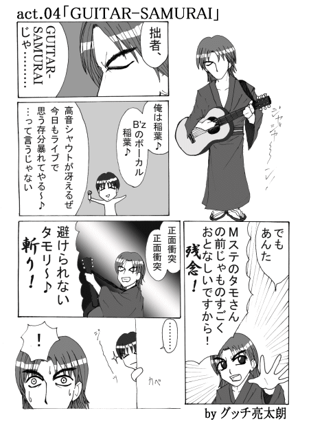| ■製作:2004年11月 お笑い芸人系ネタ第2弾。(笑) 今度は松本さんが今話題の「ギター侍」こと波田陽区のまねをしております。 これも前々から描きたかったネタで、波田陽区が売れてきたんでいける!って思って描きました。 「〜言うじゃない」「残念!」「○○斬り!」が彼の得意文句。 しかしこれも前作同様芸人を知っていないとわからないネタですね。(汗) 一応前作から続いている感があります。 前作で稲葉さんのヒロシネタを却下しておきながら密かに自分も芸人ネタの練習をしていた松本さんの図です。 最後の稲葉さんは「ずるいよ、松本さん」って訴えるような感じで…家政婦は見た的なシュチュエーションですか。(笑) 自分の中のギター侍は松本さんですよ、やっぱ。 |