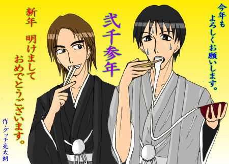 餅が上手く切れなくて困ってる稲葉さんを見ながら笑う松本さんの図。