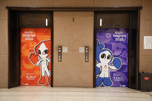 県庁のエレベーターには、アジア競技大会のマスコット「ホノホン」とアジア