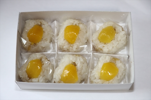 ▲10月1日(水)、栗の甘露煮がのせられている栗餅6個入り