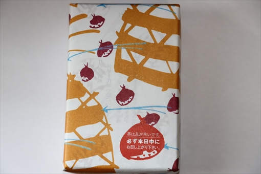 毎月1日限定で、商品が月替わり販売されている赤福の人気商品「朔日(つい たち)餅」。10月1日は、朔日餅の中でもとくに人気の高い「栗餅」です。 栗の甘露煮が乗せられ、栗が混じっていている栗餡でしっかり栗のお味を堪能 できました。包装紙一面に栗がちりばめられて、まだ夏本番の暑さですが、秋 本番を感じさせられます。(2025年10月1日)