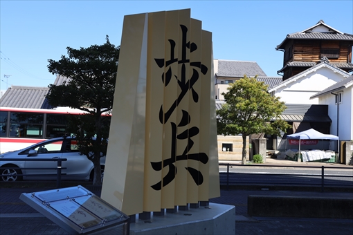 左から見ると「歩兵」に見えます。モニュメントの横には、日本将棋連盟清水
