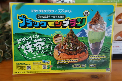 コメダ珈琲で、「シロノワール ブラックモンブラン ー宇治抹茶仕立てー」を いただきました。竹下製菓株式会社のブラックモンブラン、株式会社祇園辻利 の宇治抹茶、そしてコメダ珈琲店の看板デザート・シロノワールのコラボレー ション商品です。チョコソースの甘みと祇園辻利の宇治抹茶のほろ苦さが調和 しています。(2025年10月17日)