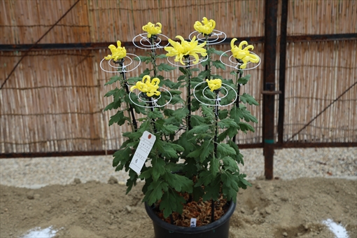 て、大菊自営花壇一本立の部(25鉢)など一部の菊の展示がはじまっていて、迫
