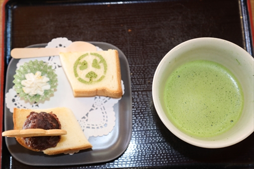 名古屋城二の丸茶亭で、「金鯱モーニング」をいただきました。金鯱モーニン グは、抹茶・コーヒー(ホット・アイス)・オレンジジュースから1つを選択。 金鯱がデザインされたクッキーがのった小倉トーストと、葵の御紋がデザイン されたトースト付です。抹茶を選び、見頃の紅葉を楽しみながら至福のひとと きをすごします。昨年より100円値上げされています。(2025年12月6日)