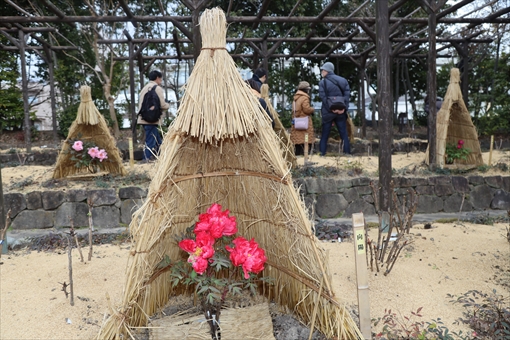 また、園内で冬牡丹の展示も始まりました。徳川園の冬牡丹は、わら囲いをし