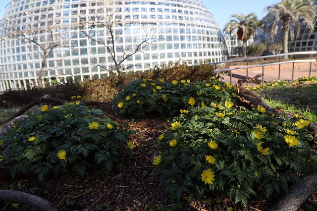 れた今日、多くの方が観梅に訪れています。また、温室前では福寿草(フクジ