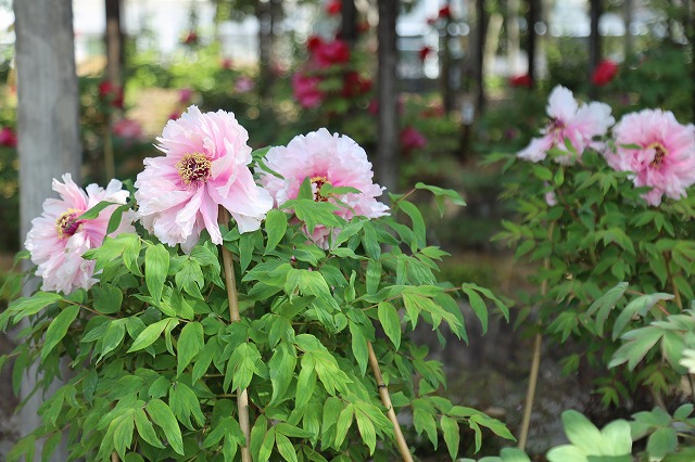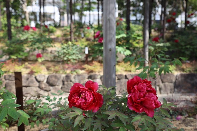 大輪が咲き揃うのが人気。園内はまばゆいばかりの緑とともに、牡丹園で赤・