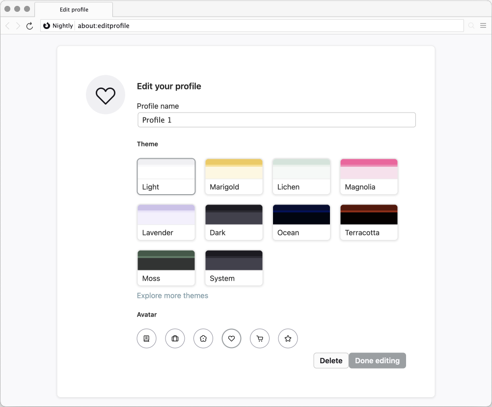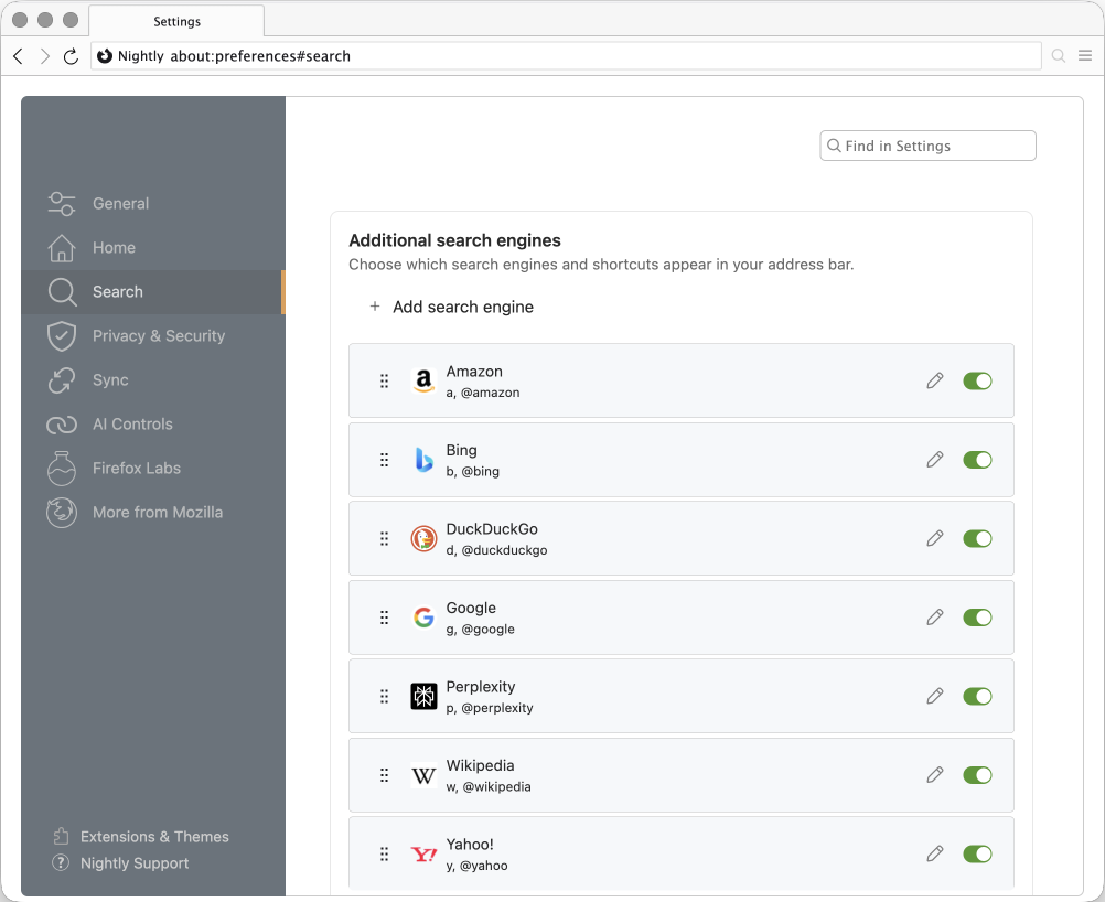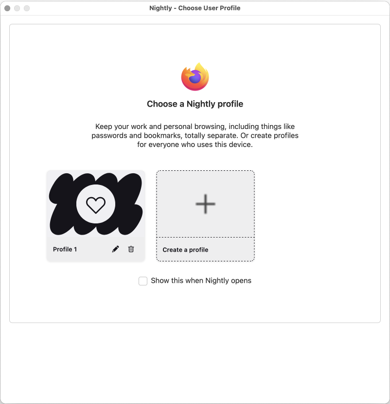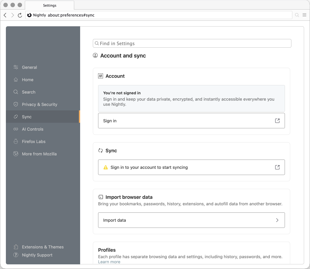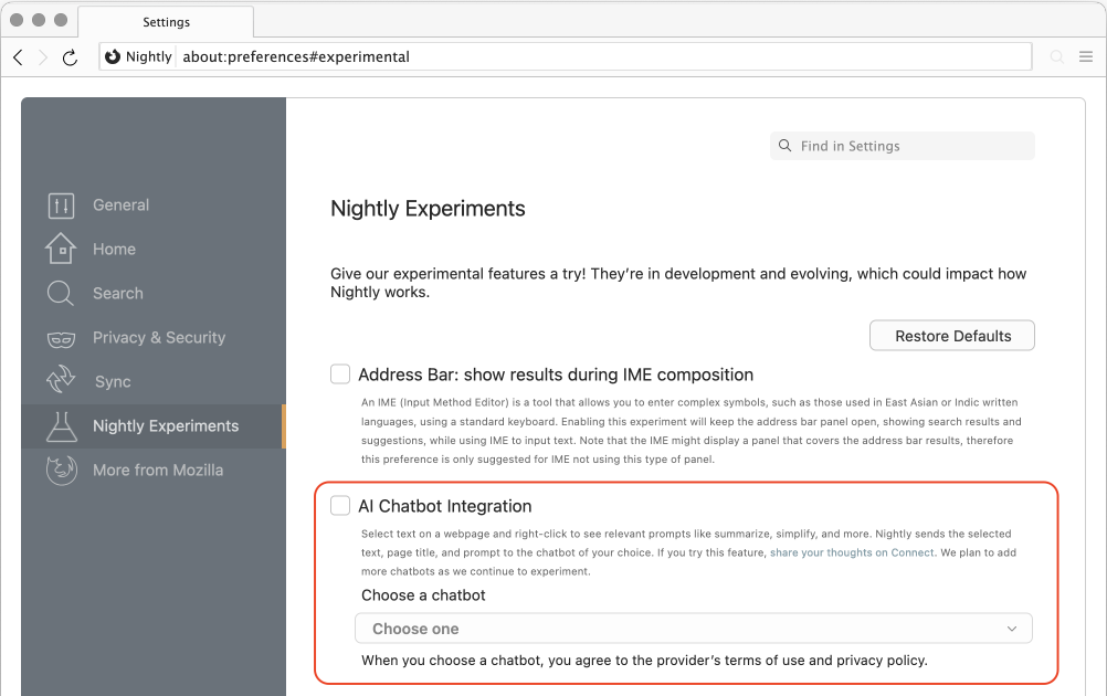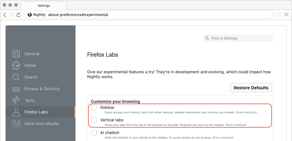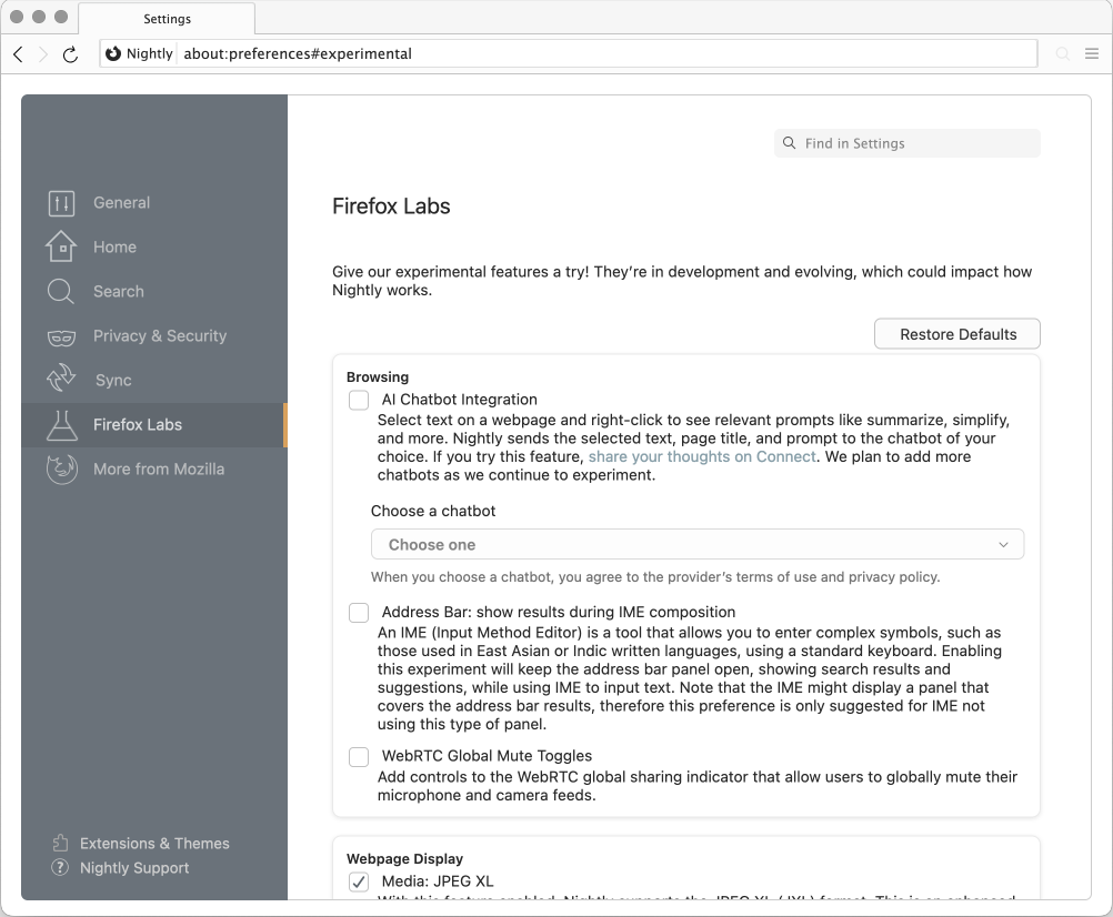 You can add a chatbot of your choice to the sidebar. (Firefox 129) If you want to activate this:Go to "about:preferences#experimental" and turn the AI Chatbot Integration experiment on. See "Experimenting with AI services in Nightly – Firefox Nightly News" for more information. Urlbar Search Mode Switcher (Firefox 129.0) If you want to try it, you set as follows:browser.urlbar.scotchBonnet.enableOverride to true;or browser.urlbar.searchModeSwitcher.featureGate to true; Redesigned Sidebar on Nightly (Firefox 128.0) and Vertical Tabs (Firefox 129.0) If you want to enable those, you set as follows and relaunch Nightly:sidebar.revamp to true; sidebar.verticalTabs to true; Disable Tab Hover Previews (Firefox 128.0) Since the bug 1893676 has ridden on the Nightly train, you set as follows:browser.tabs.hoverPreview.enabled to false; browser.tabs.hoverPreview.showThumbnails to false; New Profile Manager option added to the Hamburger Menu (Firefox 128.0) If you want to enable it, you set as follows:browser.profiles.enabled to true; "Command+F" to open and close FindBar (Firefox 128.0) Since the bug1897477 has ridden on the Nightly train, apply the following patch: