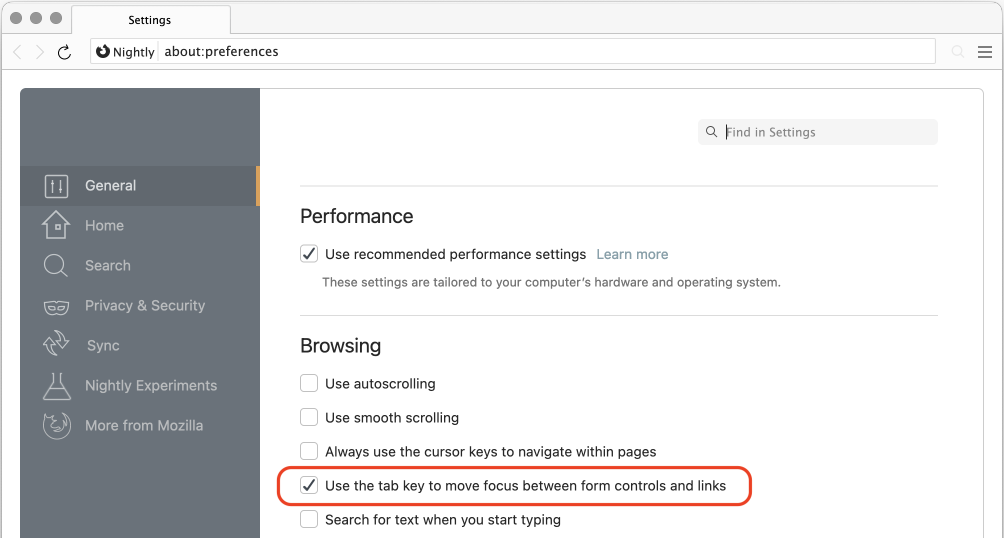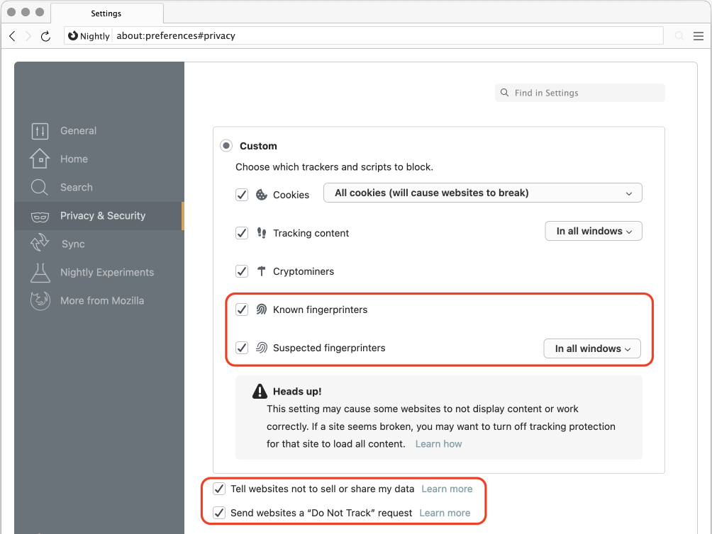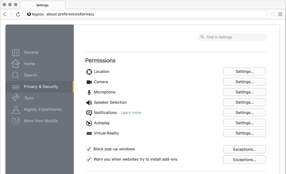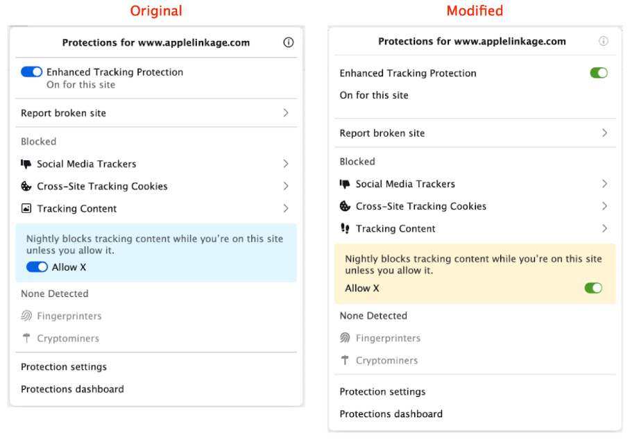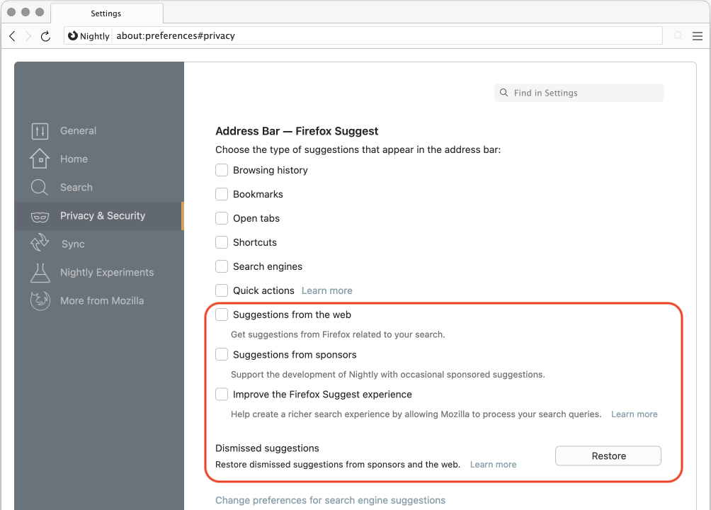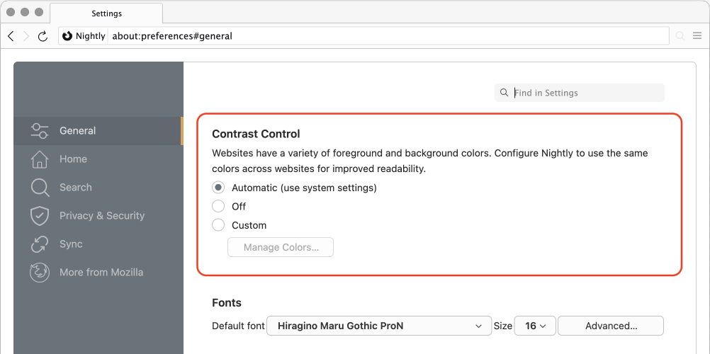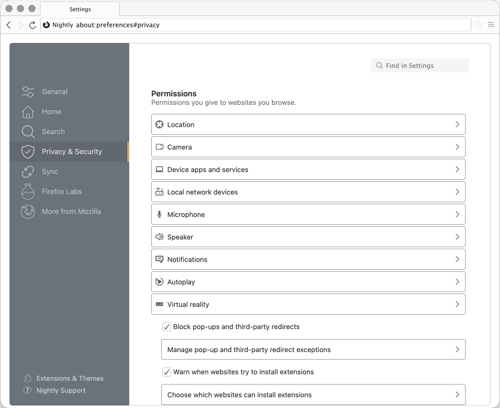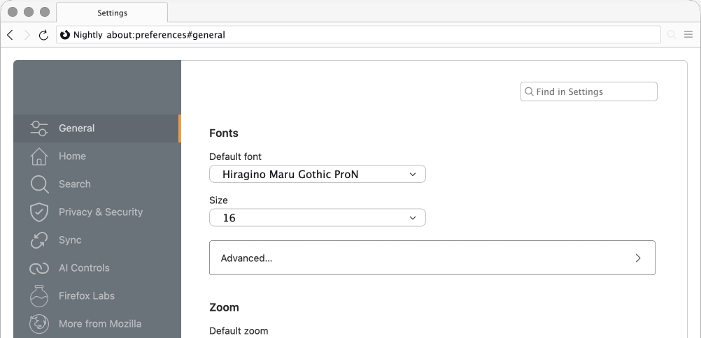 Added "Local Network Devices" section to "Preferences Privacy". (Firefox 143) The positions of the toggle buttons and labels. Since the bug 1917305 was implemented in Nightly, the position of the toggle button on the Tracking Protection Panel has been reversed from left to right. How to disable AI-powered Smart tab grouping (Firefox 141.0) If you want to disable it, you set as follows:browser.tabs.groups.smart.enabled to false; Added "Contrast Control" section to "Preferences General" instead of "Color section". (Firefox 138) "Profiles" section has been added to "Preferences General". (Firefox 137) The "Sidebar & Vertical tabs" has been removed from "Firefox Labs" and moved to the "Browser Layout" section of "Preferences General". (Firefox 136) In Reader View, the new "Text Formatting Controls" and "Theme Controls" are now the default, and "Read Aloud Controls" has been updated. How to disable Tab Groups (Firefox 135.0) If you want to disable it, you set as follows:browser.tabs.groups.enabled to false; Always show "Unified Search Button" (Firefox 135.0) If you want to enable it, you set as follows:browser.urlbar.unifiedSearchButton.always to true; Upcoming New "Profile Manager" & "Edit Profile". (Firefox 134) How to enable Tab Groups (Firefox 133.0) If you want to enable it, you set as follows:browser.tabs.groups.enabled to true; A bug reported 24 years ago has finally been fixed. (Firefox 132) The bug 71895 reported 24 years ago has finally been fixed.Bravo! Now you can try "Sidebar" and "Vertical tabs" in "Firefox Labs". (Firefox 131) "Nightly Experiments" has been renamed to "Firefox Labs" and redesigned. (Firefox 130) "Command+F" to open and close FindBar (Firefox 129.0) Since browser-command-listeners.js has been removed from the repository, apply the following patch: