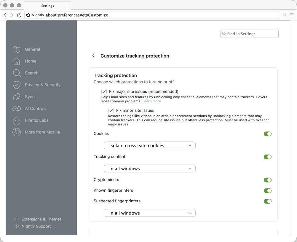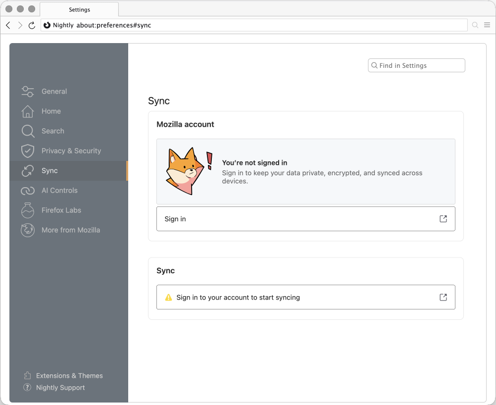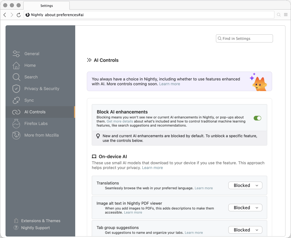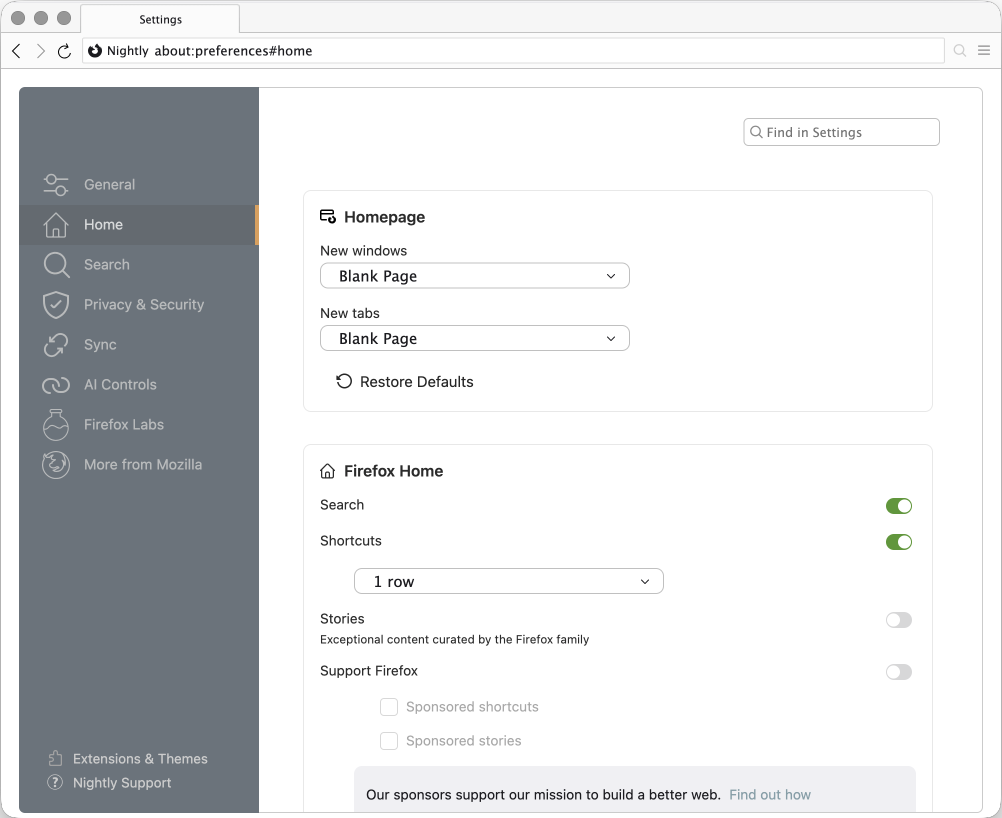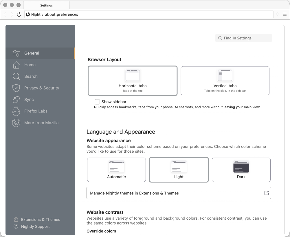 Mozilla has been working on a major UI redesign project for Firefox called "Nova". You can obtain "Nova" from the /firefox/nightly/maple repository and try it by configuring it as follows:browser.design-tokens.nova to true; browser.newtabpage.activity-stream.nova.enabled to true; browser.urlbar.nova.featureGate to true; browser.urlbar.quicksuggest.ampTopPickUseNovaIconSize to true; "Account and sync" section in the "Sync" category settings. (Firefox 151.0) How to Disable Split Screen View in Firefox To disable Split Screen View, please configure it as follows:browser.tabs.splitView.enabled to false; Mozilla has planned to redesign Firefox's settings User Interface. (Firefox 149.0) To enable New Settings Page Redesign UI, please configure it as follows:browser.settings-redesign.enabled to true; "Fonts" section in the "General" category settings of the new UI design "Browser Layout" section in the "General" category settings of the new UI design "Website language" section in the "General" category settings of the new UI design "Language - Spell check" section in the "General" category settings of the new UI design "Applications" section in the "General" category settings of the new UI design "Homepage" & "Firefox Home" section in the "Home" category settings of the new UI design "Additional search engines" section in the "Search" of the new UI design "Browser Privacy" section in the "Privacy & Security" category settings of the new UI design "Sync" section in the "Sync" category settings of the new UI design A new "AI Controls" category has been added to the settings. (Firefox 149.0) "New Tracking Protection Icon and Panel" is now available. (Firefox 145.0 and later) To enable this feature, please configure it as follows:browser.urlbar.trustPanel.featureGate to true; Since the bug 1917305 was implemented in the nightly builds, this feature has been enabled by default.