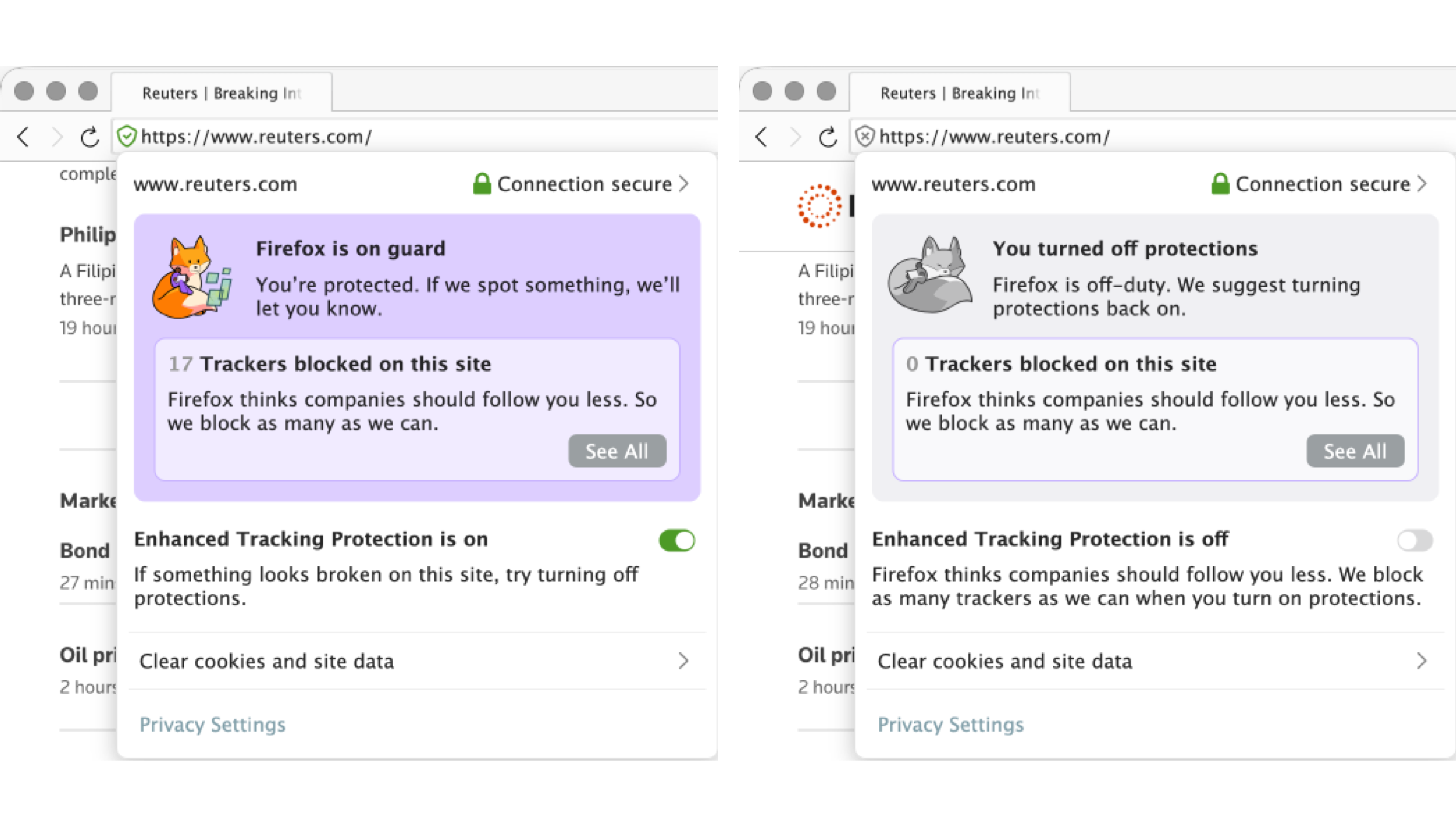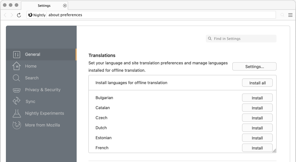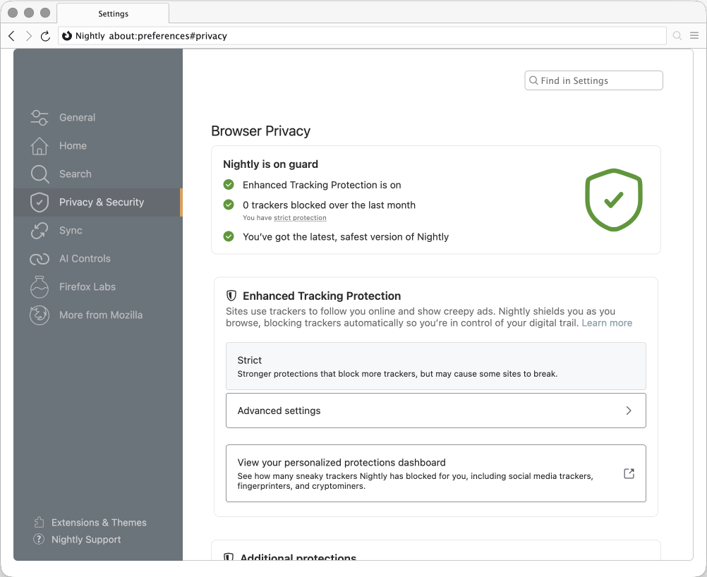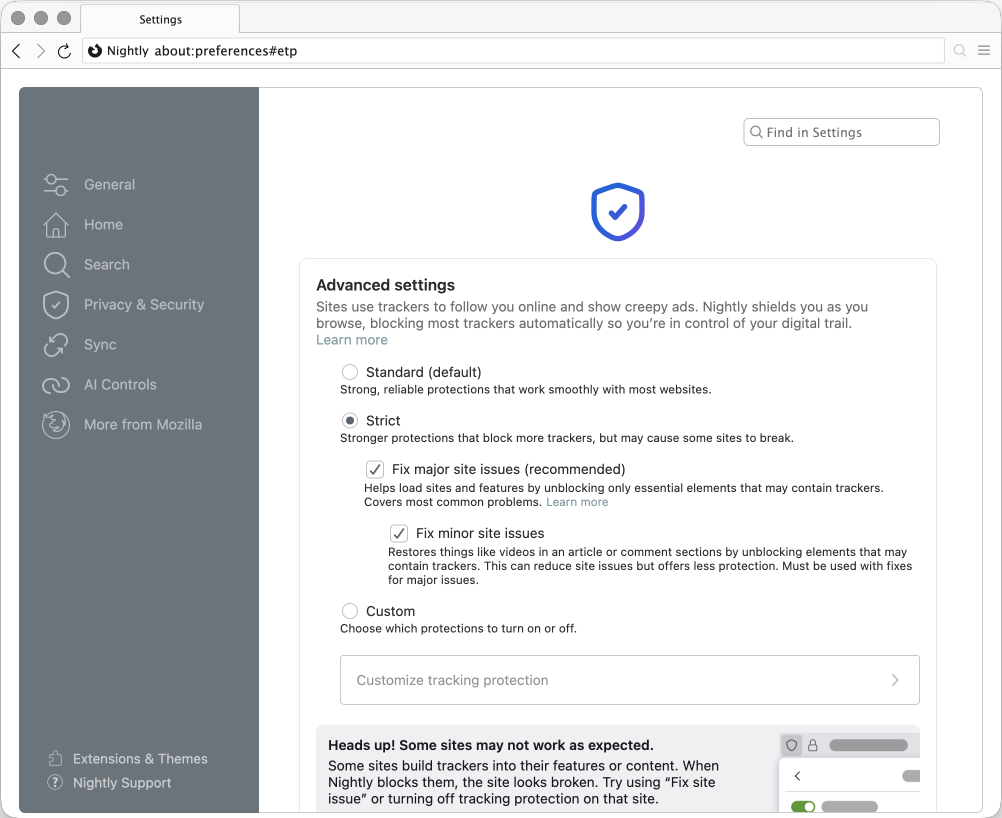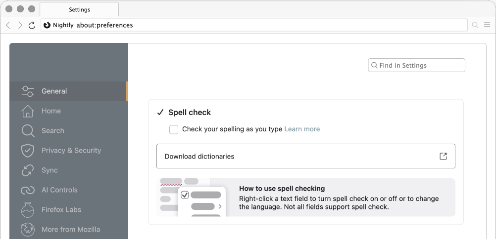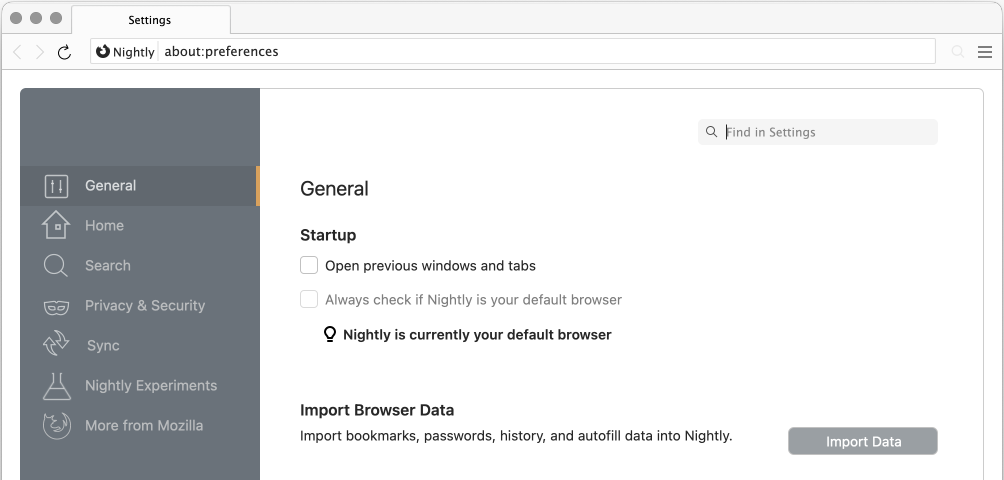 Mozilla has been working on a major UI redesign project for Firefox called "Nova". You can obtain "Nova" from the /firefox/nightly/maple repository and try it by configuring it as follows:browser.design-tokens.nova to true; browser.newtabpage.activity-stream.nova.enabled to true; browser.urlbar.nova.featureGate to true; browser.urlbar.quicksuggest.ampTopPickUseNovaIconSize to true; "Account and sync" section in the "Sync" category settings. (Firefox 151.0) How to Disable Split Screen View in Firefox To disable Split Screen View, please configure it as follows:browser.tabs.splitView.enabled to false; Mozilla has planned to redesign Firefox's settings User Interface. (Firefox 149.0) To enable New Settings Page Redesign UI, please configure it as follows:browser.settings-redesign.enabled to true; "Fonts" section in the "General" category settings of the new UI design "Browser Layout" section in the "General" category settings of the new UI design "Website language" section in the "General" category settings of the new UI design "Language - Spell check" section in the "General" category settings of the new UI design "Applications" section in the "General" category settings of the new UI design "Homepage" & "Firefox Home" section in the "Home" category settings of the new UI design "Additional search engines" section in the "Search" of the new UI design "Browser Privacy" section in the "Privacy & Security" category settings of the new UI design "Sync" section in the "Sync" category settings of the new UI design A new "AI Controls" category has been added to the settings. (Firefox 149.0) "New Tracking Protection Icon and Panel" is now available. (Firefox 145.0 and later) To enable this feature, please configure it as follows:browser.urlbar.trustPanel.featureGate to true; Since the bug 1917305 was implemented in the nightly builds, this feature has been enabled by default.