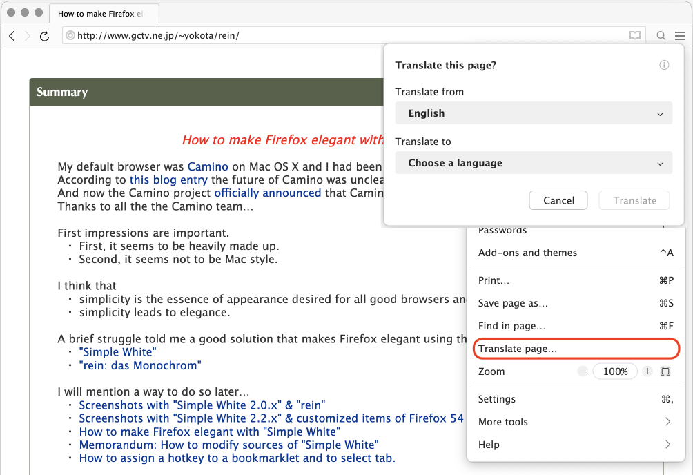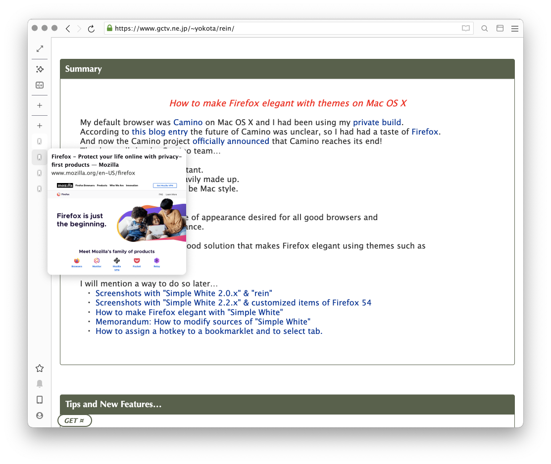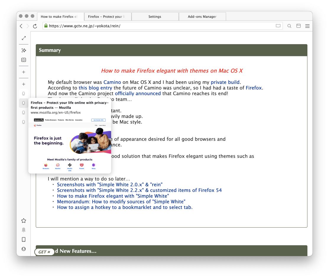 How to customize Firefox and make it simple and elegant on macOS My default browser was Camino on Mac OS X and I had been using my private build.According to this blog entry the future of Camino was unclear, so I had had a taste of Firefox. And now the Camino project officially announced that Camino reaches its end! Thanks to all the the Camino team… Well, regarding my first impressions of Firefox; First impressions are important. ・ First, it seemed to be heavily made up. ・ Second, it seemed not to be Mac style. I think that ・ simplicity is the essence of appearance desired for all good browsers and ・ simplicity leads to elegance. After conducting a brief struggle, I found an appropriate solution—applying themes like "Simple White" to give Firefox a polished appearance. However, since the bug 1447903 landed on Firefox Nightly repository, add-ons such as "Simple White" have stopped functioning properly. As a result, the source files had to be directly replaced as follows: Firefox Nightly.app/Contents/Resources/browser/omni.ja/chrome/browser/content/browser/* Firefox Nightly.app/Contents/Resources/browser/omni.ja/chrome/browser/skin/classic/browser/* Firefox Nightly.app/Contents/Resources/omni.jachrome/toolkit/content/global/elements/* Firefox Nightly.app/Contents/Resources/omni.ja/chrome/toolkit/skin/classic/global/* Firefox Nightly.app/Contents/Resources/omni.ja/chrome/toolkit/skin/classic/mozapps/* and so on… This will restore the "SimpleWhite" as the default theme, as shown in the screenshots below. And then I've been using my customized Firefox Nightly as my default browser. In this note, I'll show some tips and screenshots about my customized Firefox. Tips and New Features…