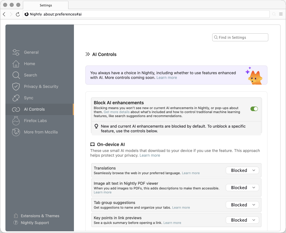 The "Applications" section in the "General" category settings has been redesigned. (Firefox 149) The "Fonts" section in the "General" category settings has been redesigned. (Firefox 149) A new "AI Controls" category has been added to the settings. (Firefox 149.0) The "Browser Layout" section in the "General" category settings has been redesigned. (Firefox 149) "New Tracking Protection Icon and Panel" is now available. (Firefox 145.0 and later) To enable this feature, please configure it as follows:browser.urlbar.trustPanel.featureGate to true; Since the bug 1917305 was implemented in the nightly builds, this feature has been enabled by default.